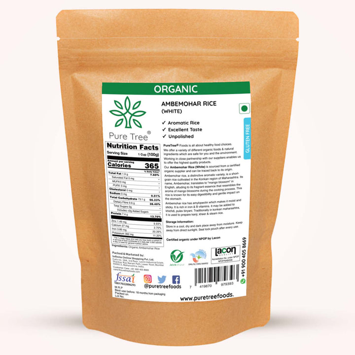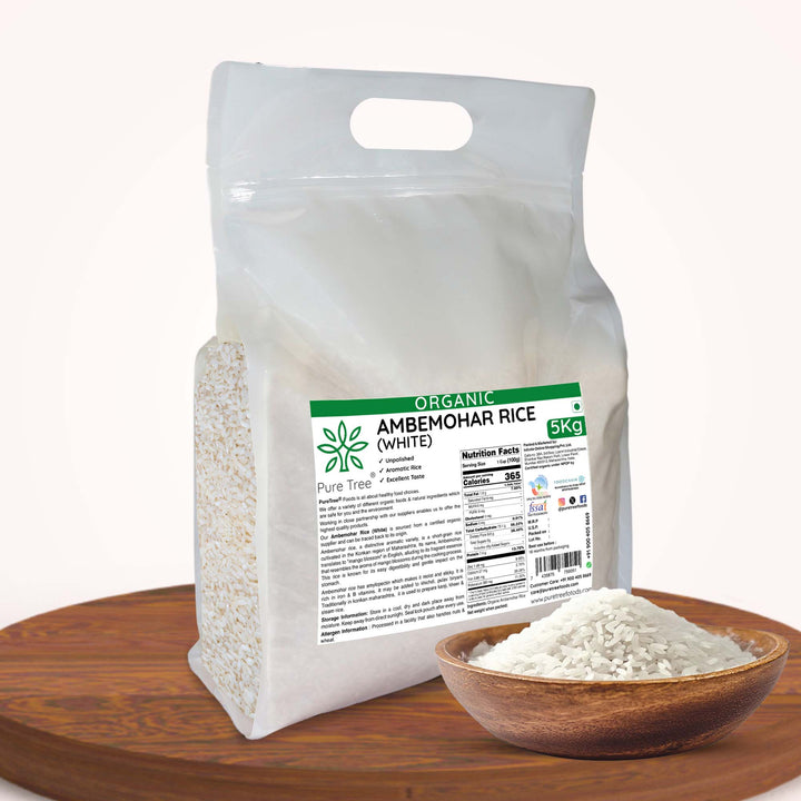 CERTIFIED ORGANIC AMBEMOHAR WHITE RICE - Ambemohar means fragrance of mango blossoms, it is known for its unique aroma and taste. The grain is short, white translucent appearance, primarily grown in Maharashtra.