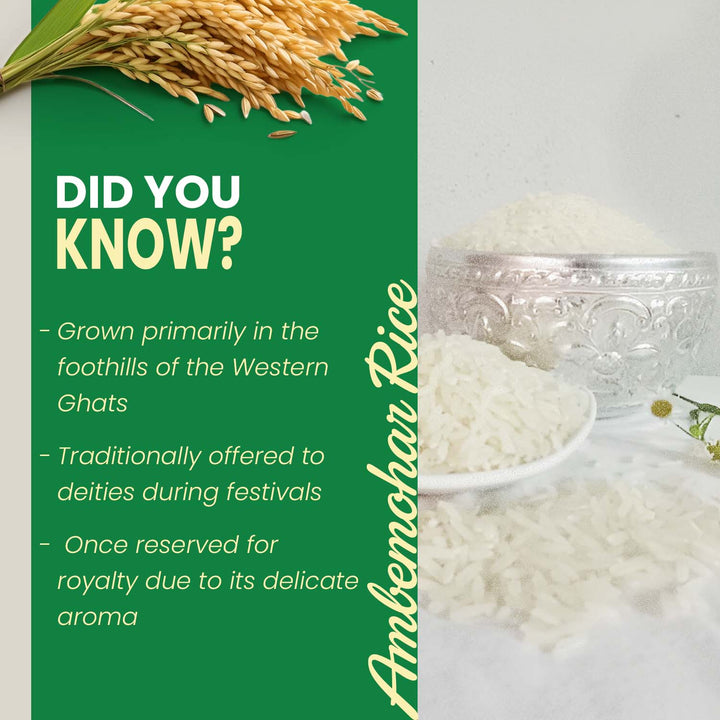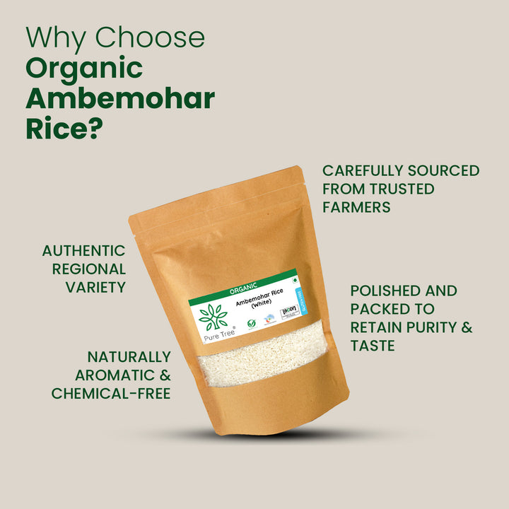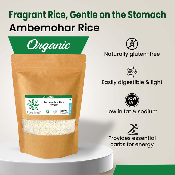 HEALTH BENEFITS- Organic Ambemohar rice are low-fat, gluten-free source of energy-rich carbs with a mild flavor, making it versatile and nutritious addition to a balanced diet.