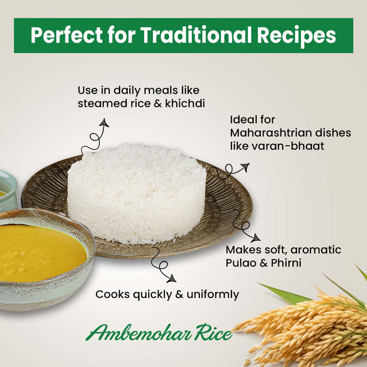 USE- Ambemohar rice is a aromatic rice used in various traditional dishes in India, often used to make flavourful rice pulao, Ambemohar flour bhakri, Biryani rice, sweet dish Rice Kheer, puddings etc.