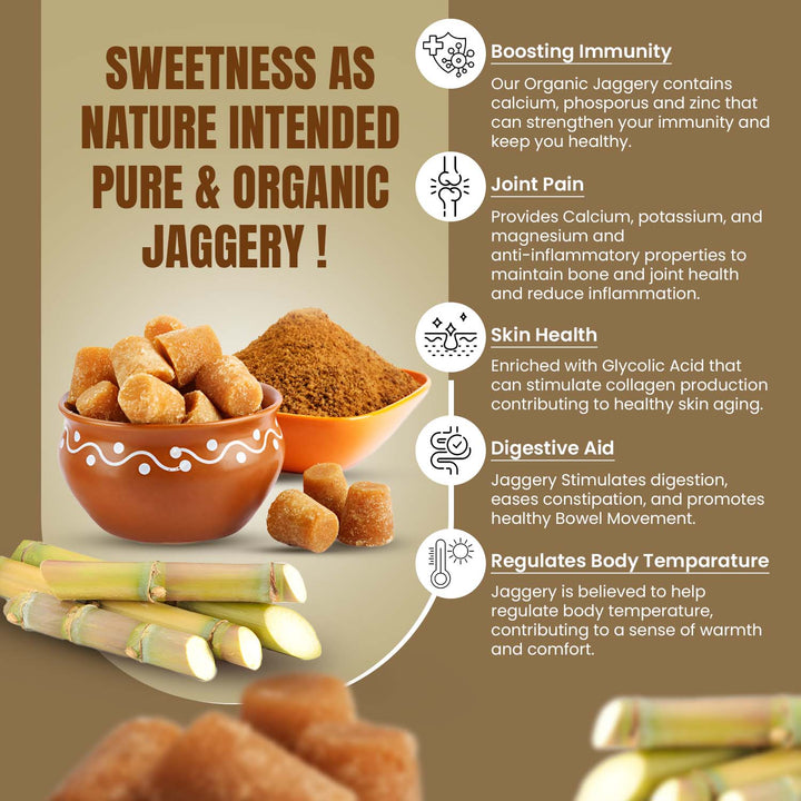 USE- Use Pure Jaggery for babies, jaggery cube acts as a healthier alternative to processed sugar and artificial sweeteners in your beverages sourced from Certified Organic Farms.