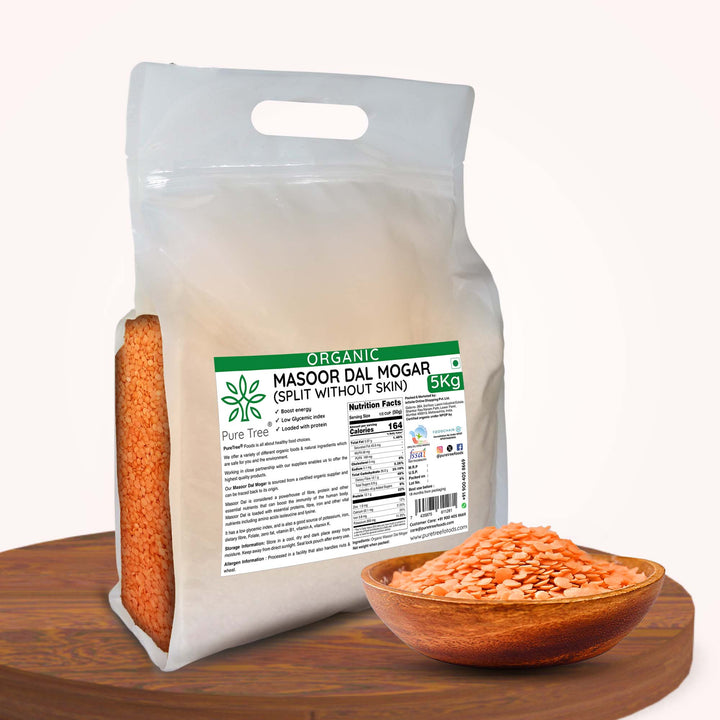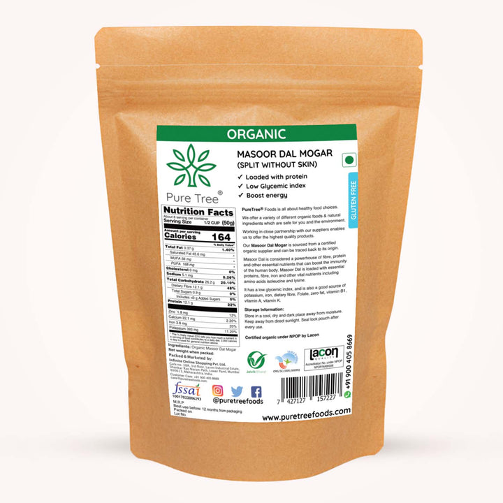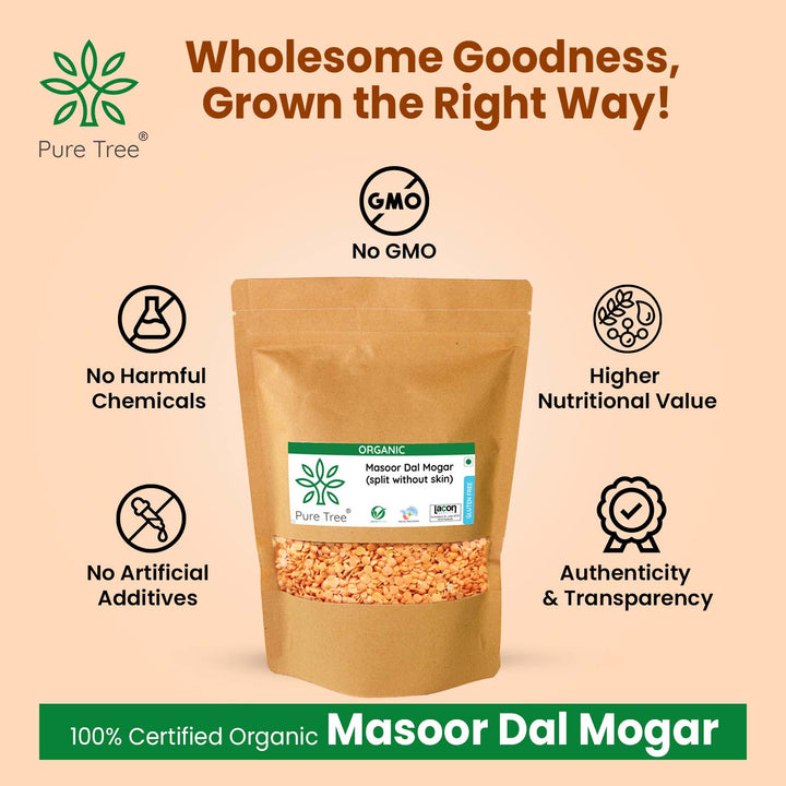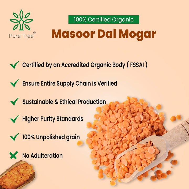 CERTIFIED ORGANIC MASOOR DAL SPLIT WITHOUT SKIN - Split masoor dal without skin refers to red lentils that have been hulled and split, resulting in a smooth texture & quicker cooking time compared to whole lentils.