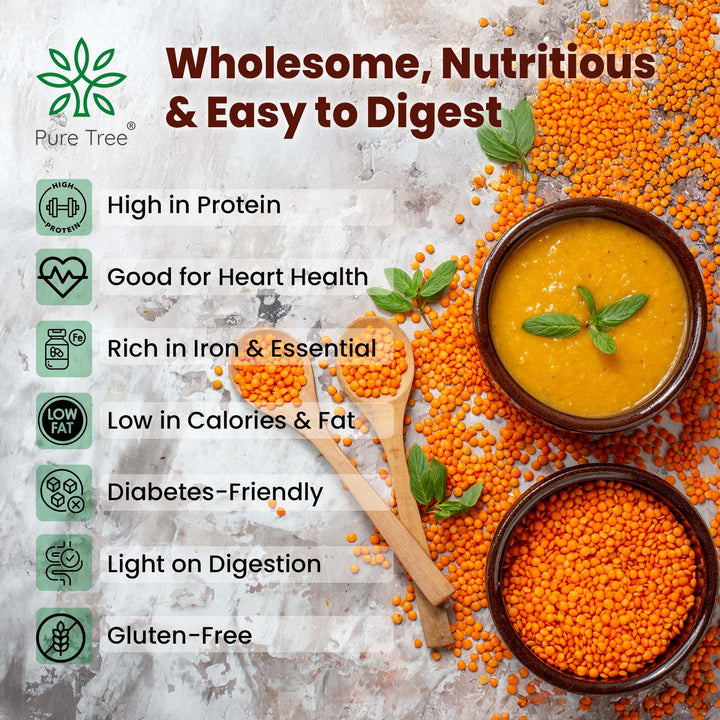 HEALTH BENEFITS- Split masoor dal, also known as red lentils, is a highly nutritious legume rich in protein, fiber, vitamins & minerals, offering benefits such as improved heart health, digestion, and energy levels.