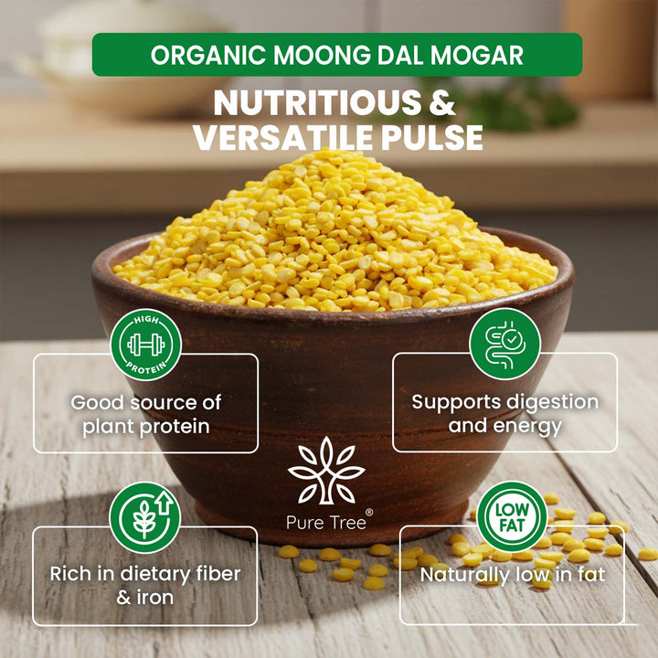 HEALTH BENEFITS- Yellow moong dal is rich in protein, dietary fiber, vitamin B and folate, and minerals like potassium, magnesium, & iron. Dhuli moong dal is low in fat and high plant-based protein.